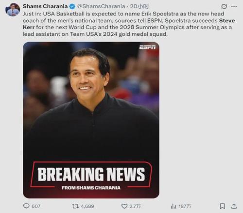 北京时间10月11日,据NBA名记Shams报道,斯波尔斯特拉接替科尔,成为美国男篮新一任主教练,率队征战2027年篮球世界杯和2028年洛杉矶奥运会。科尔在2021年成为美国男篮主帅,率队出战了2023年世界杯和2024年奥运会。