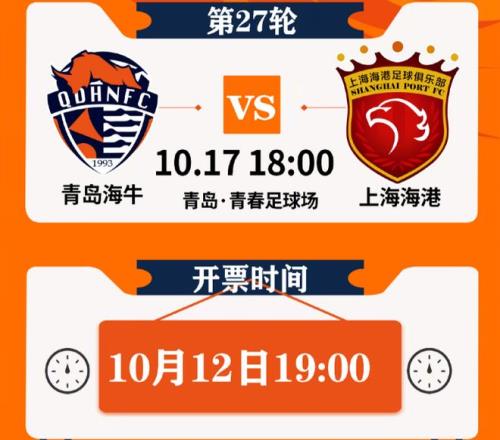 10月17日(星期五)18:00,在2025赛季中超联赛第27轮,也就是倒数第4轮中,青岛海牛将坐镇主场青岛青春足球场,迎战上海海港。10月11日,青岛海牛足球俱乐部发布了这场比赛的票务公告。