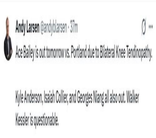 Andy Larsen写道:埃斯·贝利因双膝肌腱炎症将缺席明天对阵开拓者的比赛。此外,李凯尔、以赛亚·科利尔和乔治·尼昂也都将缺席,凯斯勒出战成疑。