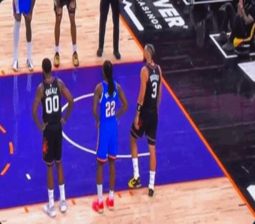最后8.2秒,奥尼尔成功解决了世界性难题——边线发球。布克接球后,手握雷神之锤,面对雷霆俩个疯狗式防守的卡鲁索和多特,3分线外强行干拔,一剑封喉,绝杀雷霆。